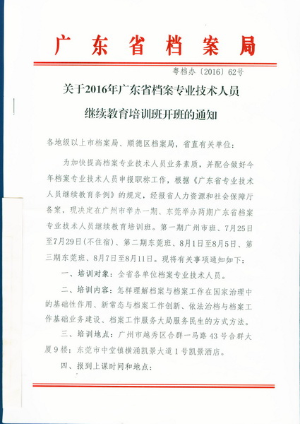 关于2016年广东省档案专业技术人员继续教育培训班开班的通知