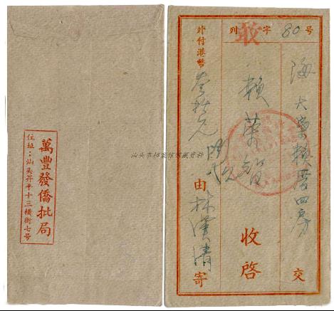 林汉清寄海阳(今潮州)大寮赖厝赖荣志侨批,由万丰发侨批局分发
