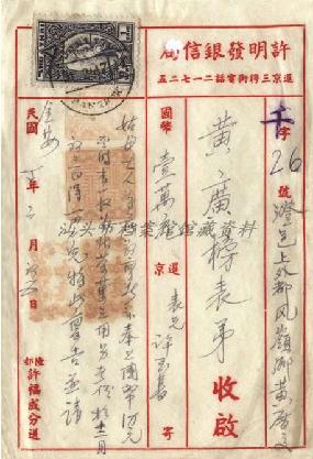 泰国许玉书经许明发银信局寄澄海凤岭黄广榜,由许福成分送的侨批