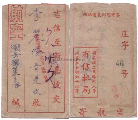 潮安鹳巢乡母亲寄新加坡李楚橙的回批由有信批局收寄