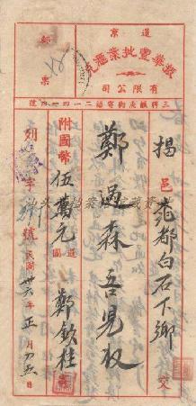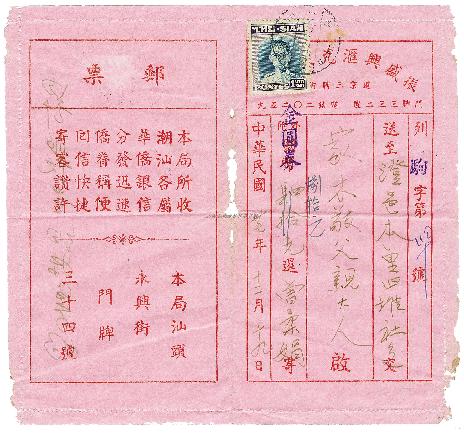 鄞永南寄海(今潮州)洪名乾的侨批通知书 由森春批局分发