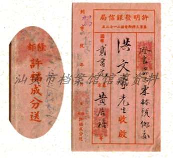 泰国黄居禧经许明发银信局寄澄海东林头洪文豪由许福成分送的侨批