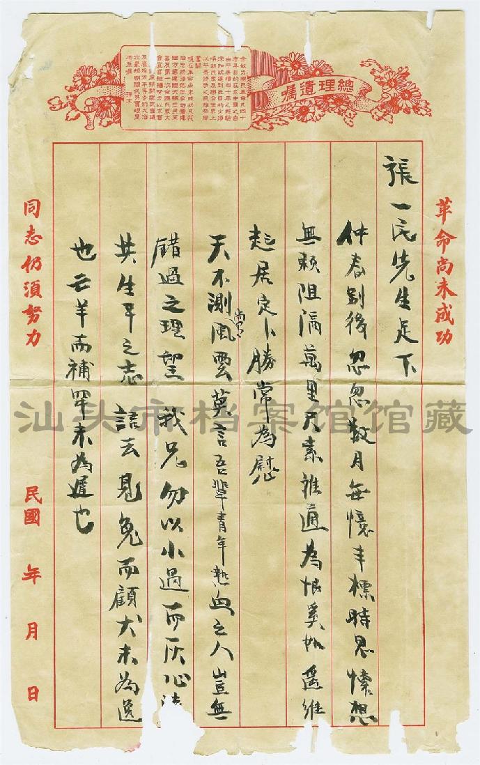 在汕头市档案馆馆藏侨批中,有一封寄给张一民先生的信。虽然内容不甚完整,但从字里行间我们仍然能看到那真挚的友谊和热血青年的壮志豪情。