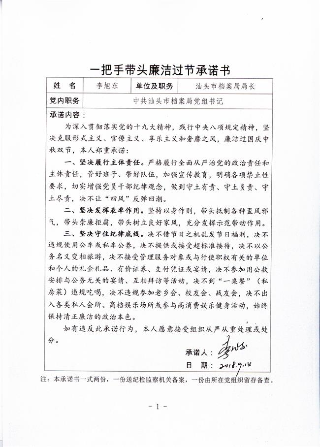 一把手带头廉洁过节承诺书