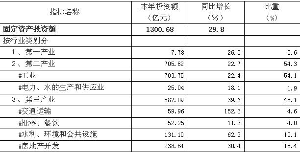 (二)三次产业结构优化提升。前三季,全市第一产业投资7.78亿元,同比增长26.0%;第二产业投资706.60亿元,同比增长22.8%;第三产业投资586.30亿元,同比增长39.4%,增幅比一季度大幅提高18.4个百分点,占整体投资的比重为45.1%,占比较去年同期提高3.2个百分点,其中:租赁和商务服务同比增长96.1%,水利、环境和公共设施管理业同比增长61.3%,卫生和社会工作同比增长26.8%,居民服务、修理和其他服务业同比增长97.2%。