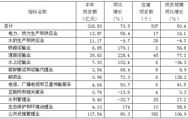 (一)基础设施建设步伐加快。在潮汕环线、海湾隧道、汕头火车站综合客运枢纽首期工程等项目的带动下,基础设施建设提速推进,前三季基础设施投资完成218.83亿元,同比增73.5%,其中:交通运输业投资同比增长183.6%,公共设施业同比增长80.3%,生态保护和环境治理业高速增长174.0%。随着中心城区市政道路沥青化启动、小公园开埠区修复改造首期工程、中以(汕头)科技创新合作区市政道路及配套工程等基础设施建设项目等项目的有序推进,城市建设投资完成132.46亿元,同比增长70.6%。