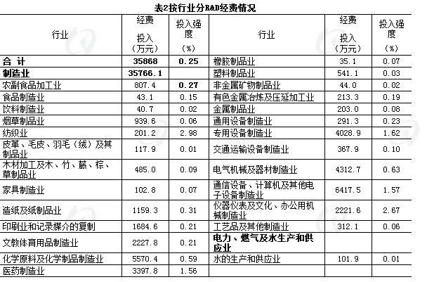 按行业分,制造业R&D经费35766.1万元,占99.72%(详见表2)。
