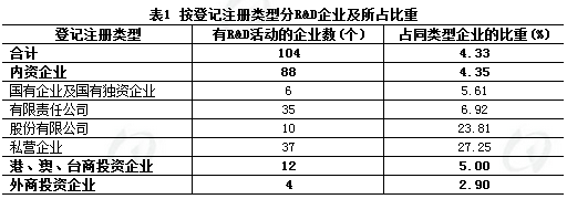 在开展R&D活动的企业中,国有企业及国有独资企业6个,占5.77%;其他内资企业82个,占78.85%;港、澳、台商投资企业12个,占11.54%;外商投资企业4个,占3.84%(详见表1)。