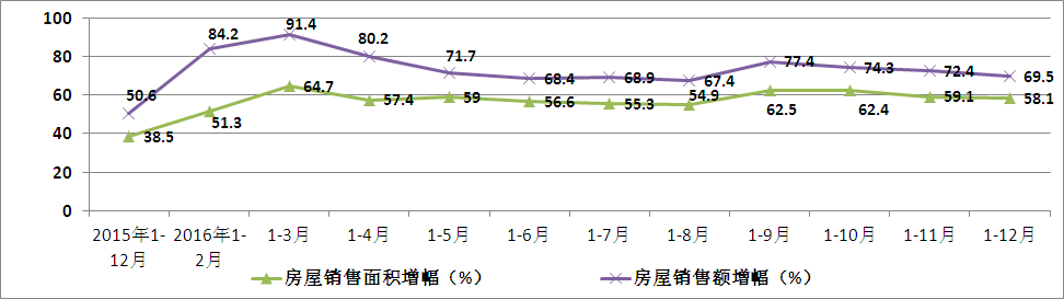 1-12月份,商品房销售面积353.45万平方米,同比增长58.1%。其中,住宅销售面积322.74万平方米,增长60.6%。