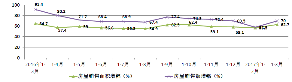 1-3月份,商品房销售面积70.39万平方米,同比增长62.7%。其中,住宅销售面积62.94万平方米,增长61.6%。