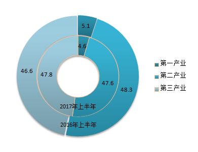 经省统计局核定,2017年上半年全市实现地区生产总值1064.87亿元,同比增长9.1%。其中:第一产业增加值48.62亿元,增长3.2%;第二产业增加值507.41亿元,增长8.2%;第三产业增加值508.84亿元,增长10.7%。三次产业结构为4.6:47.6:47.8,第三产业占比同比提高1.2个百分点。