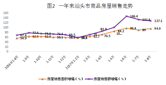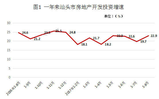 2017年 1-8月,汕头市房地产开发投资203.13亿元,同比增长22.9%,增速比1-7月提高3.2个百分点。其中,住宅投资132.78亿元,增长18.4%,增速回落1.4个百分点。住宅投资占房地产开发投资的比重为65.4%,比前1-7月回落2.3个百分点。
