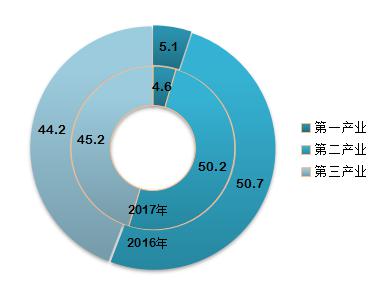 经省统计局核定,2017年全市实现地区生产总值2350.76亿元,同比增长9.2%。其中:第一产业增加值108.25亿元,增长2.9%;第二产业增加值1181.12亿元,增长8.8%;第三产业增加值1061.39亿元,增长10.4%。三次产业结构为4.6:50.2:45.2,第三产业占比同比提高1个百分点。